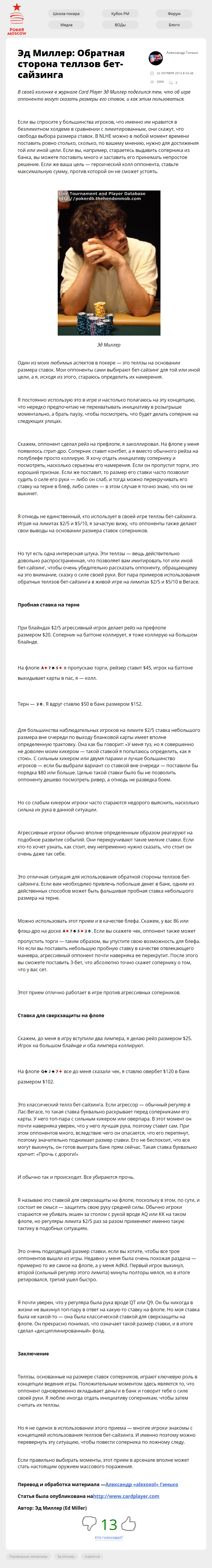 В своей колонке в журнале Card Player Эд Миллер поделился тем, что об игре оппонента могут сказать размеры его ставок, и как этим пользоваться.
