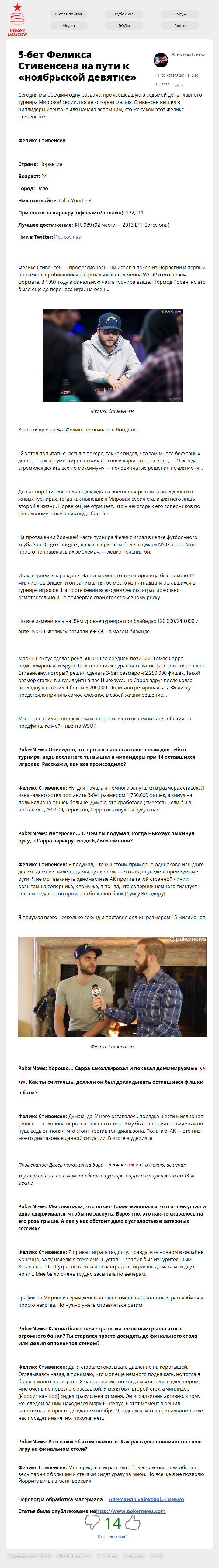 Сегодня мы обсудим одну раздачу, произошедшую в седьмой день главного турнира Мировой серии, после которой Феликс Стивенсен вышел в чиплидеры ивента. А для начала вспомним, кто же такой этот Феликс Стивенсен?