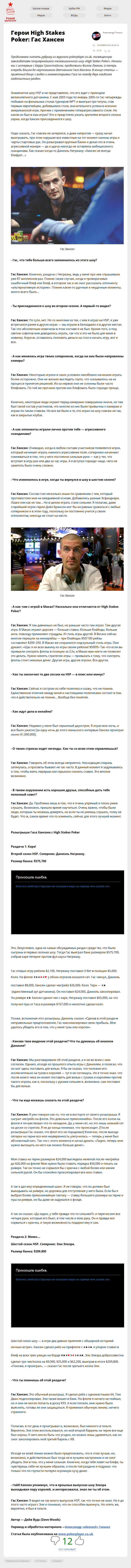 Продолжаем читать рубрику из журнала pokerplayer.co.uk, посвященную завсегдатаям популярнейшего телевизионного шоу «High Stakes Poker». Начали мы с интервью с Барри Гринстайном, продолжили Филом Лааком, а теперь очередь дошла до неутомимого датчанина Гаса Хансена. В конце статьи — приятный бонус с видео и комментариями Гаса по поводу двух наиболее…