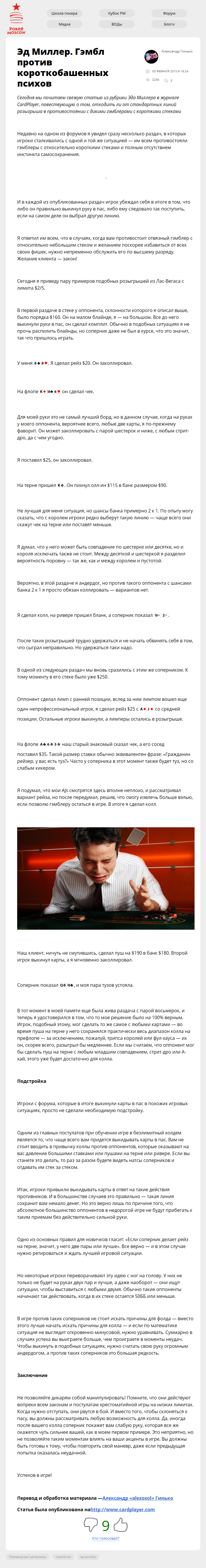 Сегодня мы почитаем свежую статью из рубрики Эда Миллера в журнале CardPlayer, повествующую о том, отходить ли от стандартных линий розыгрыша в противостоянии с дикими гэмблерами с короткими стеками