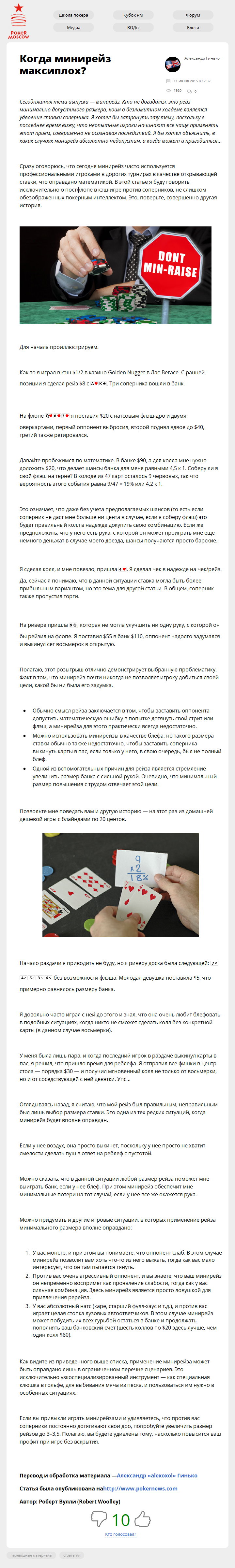 Сегодняшняя тема выпуска — минирейз. Кто не догадался, это рейз минимально допустимого размера, коим в безлимитном холдеме является удвоение ставки соперника. Я хотел бы затронуть эту тему, поскольку в последнее время вижу, что неопытные игроки начинают все чаще применять этот прием, совершенно не осознавая последствий. Я бы хотел объяснить, в…