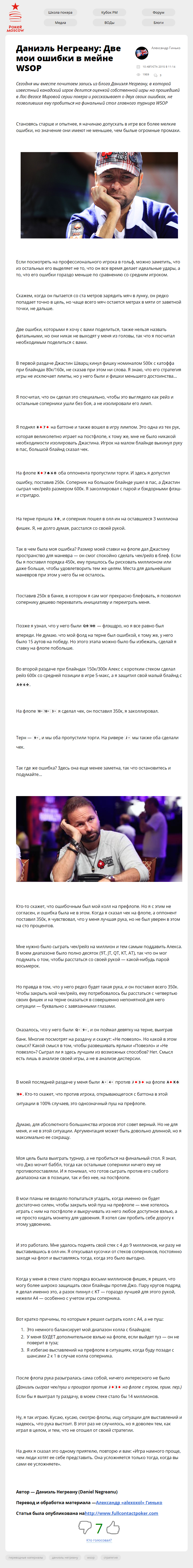 Сегодня мы вместе почитаем запись из блога Даниэля Негреану, в которой известный канадский игрок делится оценкой собственной игры на прошедшей в Лас-Вегасе Мировой серии покера и рассказывает о двух своих ошибках, не позволивших ему пробиться на финальный стол главного турнира WSOP