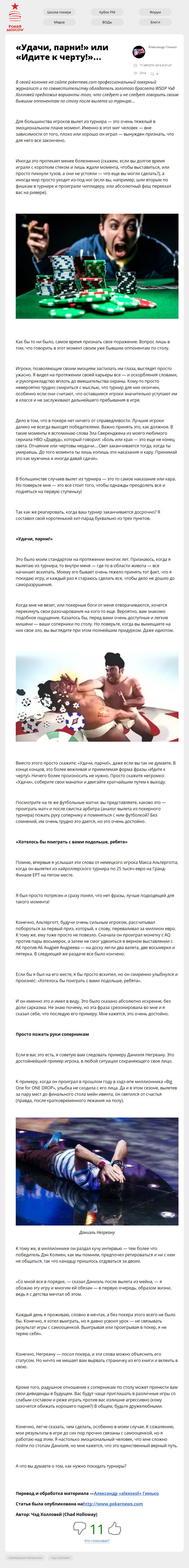 В своей колонке на сайте pokernews.com профессиональный покерный журналист и по совместительству обладатель золотого браслета WSOP Чэд Холловей предложил варианты того, что следует и не следует говорить своим бывшим оппонентам по столу после вылета из турнира…