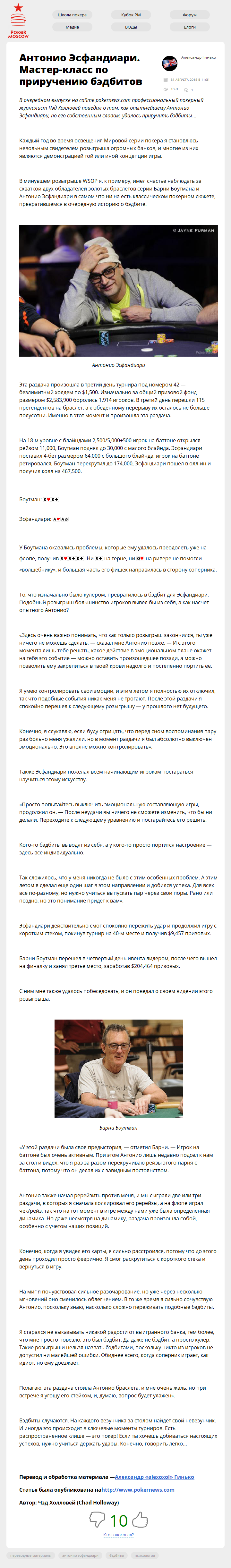 В очередном выпуске на сайте pokernews.com профессиональный покерный журналист Чэд Холловей поведал о том, как опытнейшему Антонио Эсфандиари, по его собственным словам, удалось приручить бэдбиты…