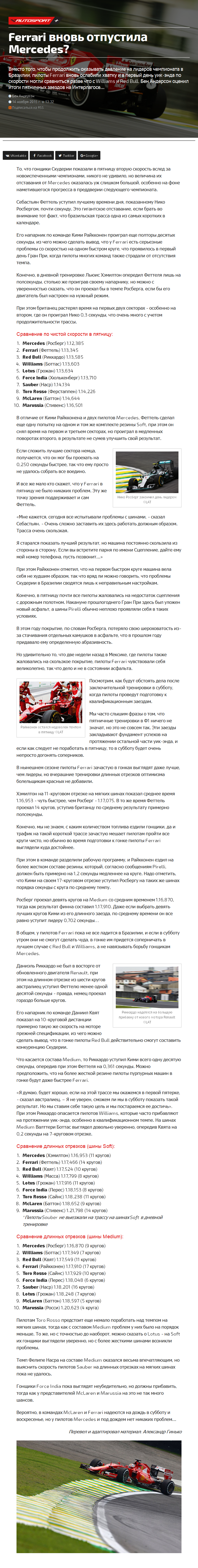 Вместо того, чтобы продолжить оказывать давление на лидеров чемпионата в Бразилии, пилоты Ferrari вновь ослабили хватку и в первый день уик-энда по скорости могли сравниться разве что с Williams и Red Bull. Бен Андерсон оценил итоги пятничных заездов на Интерлагосе…