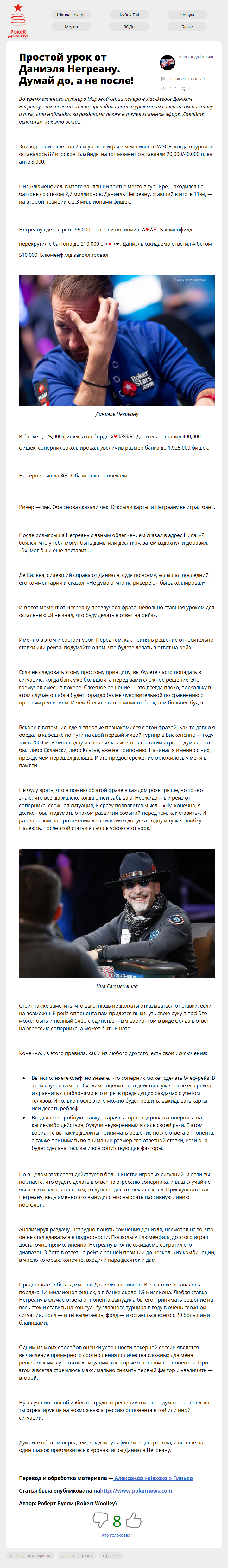 Во время главного турнира Мировой серии покера в Лас-Вегасе Даниэль Негреану, сам того не желая, преподал ценный урок своим соперникам по столу и тем, кто наблюдал за раздачами позже в телевизионном эфире. Давайте вспомним, как это было…