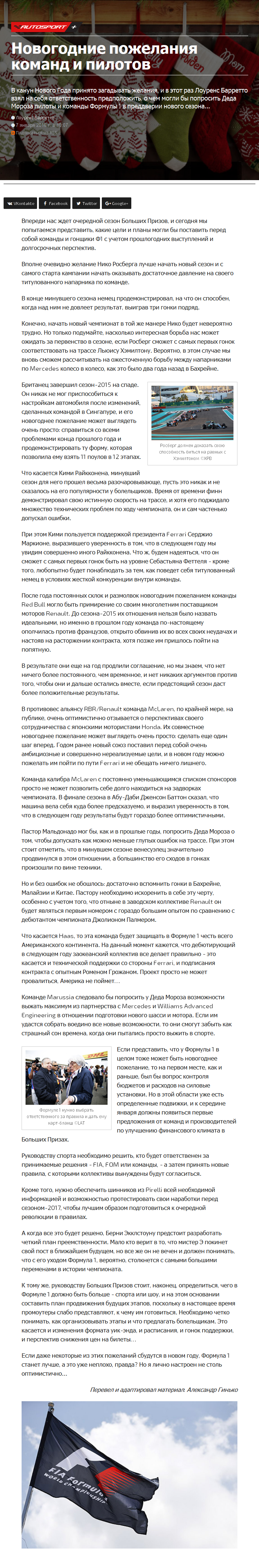 Новогодние пожелания команд и пилотов Опубликовано 07.01.201631.01.2019 Опубликовано по ссылке: В канун Нового Года принято загадывать желания, и в этот раз Лоуренс Барретто взял на себя ответственность предположить, о чем могли бы попросить Деда Мороза пилоты и команды Формулы 1 в преддверии нового сезона…