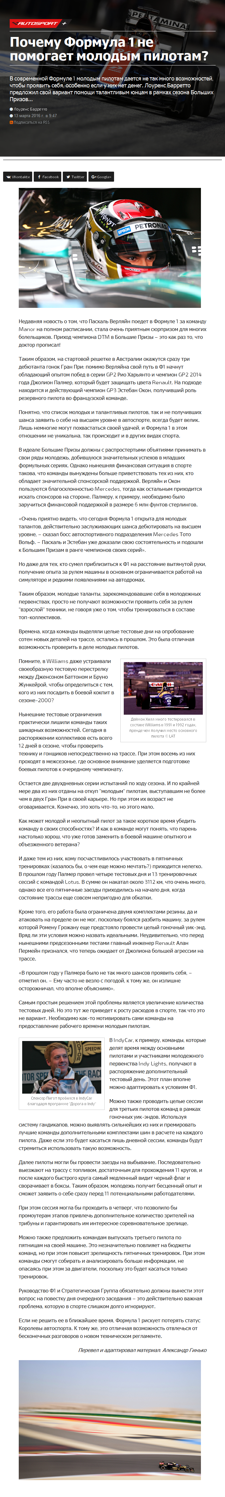 Почему Формула 1 не помогает молодым пилотам? Опубликовано 13.03.201631.01.2019 Опубликовано по ссылке: В современной Формуле 1 молодым пилотам дается не так много возможностей, чтобы проявить себя, особенно если у них нет денег. Лоуренс Барретто предложил свой вариант помощи талантливым юнцам в рамках сезона Больших Призов…