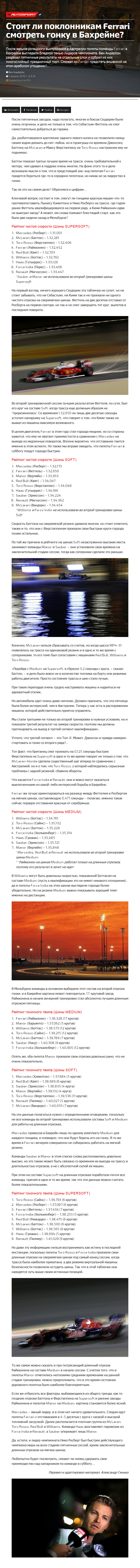 После весьма успешного выступления в Австралии пилоты команды Ferrari в Бахрейне выглядели бледной тенью лидеров чемпионата. Бен Андерсон разрезал пятничные результаты на отдельные слои и собрал из них многослойный праздничный торт. Сможет ли Ferrari предстать вишенкой на этом арабском угощении?..
