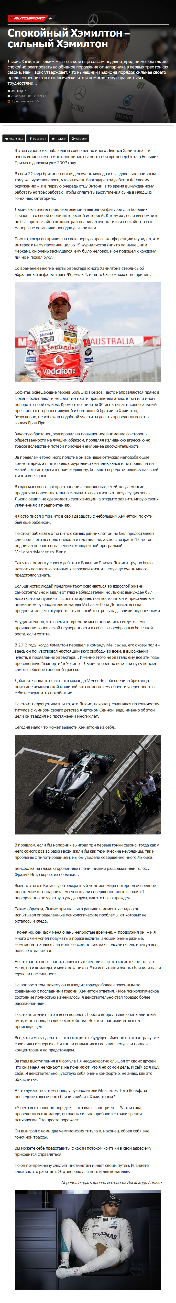 Льюис Хэмилтон, каким мы его знали еще совсем недавно, вряд ли мог бы так же спокойно реагировать на обидное поражение от напарника в первых трех гонках сезона. Иан Паркс утверждает, что нынешний Льюис на порядок сильнее своего предшественника психологически, что и помогает ему справляться с трудностями…