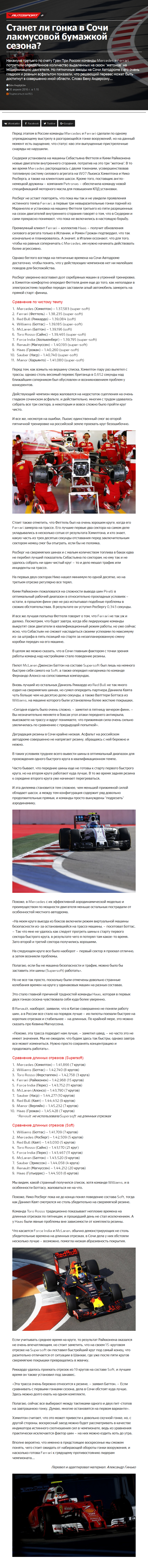 Накануне третьего по счету Гран При России команды Mercedes и Ferrari потратили определенное количество выделенных на сезон "жетонов" на модернизацию двигателя. Но пятничные заезды на Сочи Автодроме с его очень гладким и ровным асфальтом показали, что решающий перевес может быть достигнут в совершенно иной области. Слово Бену Андерсону…