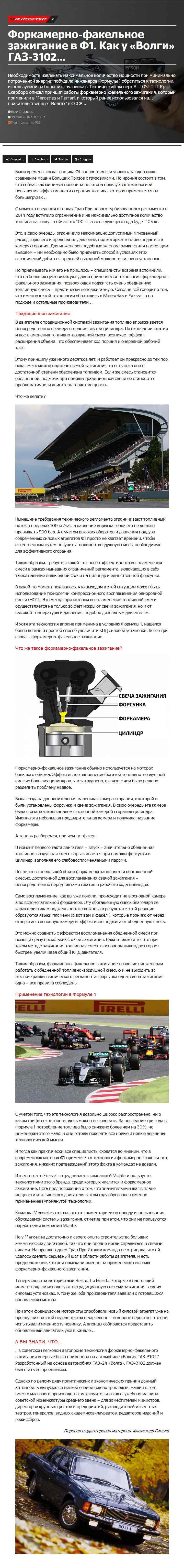 Необходимость извлекать максимальное количество мощности при минимально потраченной энергии побудила инженеров Формулы 1 обратиться к технологии, используемой на больших грузовиках. Технический эксперт AUTOSPORT Крэг Скарборо описал принцип работы форкамерно-факельного зажигания, который применили в Mercedes и Ferrari, и который ранее использовался на… правительственных "Волгах" в СССР…