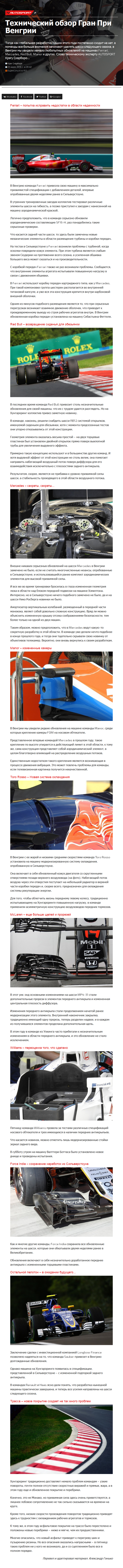 Тогда как глобальная разработка машин этого года постепенно сходит на нет, а команды все больше внимания начинают уделять шасси следующего сезона, в Венгрии мы увидели немало любопытных обновлений на машинах Ferrari, Mercedes, Red Bull, Manor и других. Слово техническому эксперту AUTOSPORT Крэгу Скарборо…