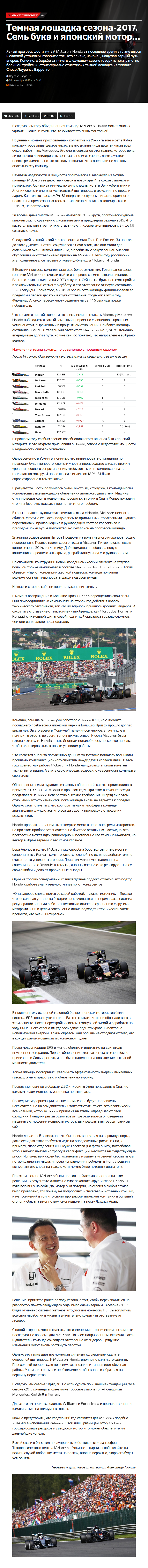 Явный прогресс, достигнутый McLaren-Honda за последнее время в плане шасси и силовой установки, говорит о том, что альянс, наконец, нащупал верный путь вперед. Конечно, о борьбе за титул в следующем сезоне говорить пока рано, но большой тройке Ф1 стоит серьезно отнестись к темной лошадке из Уокинга. Слово Лоуренсу Барретто…
