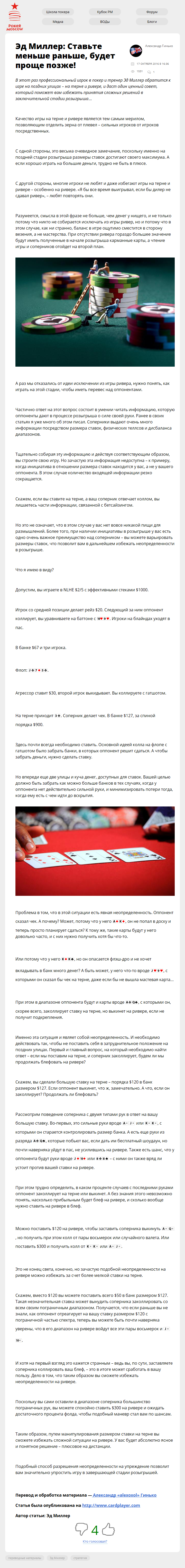 В этот раз профессиональный игрок в покер и тренер Эд Миллер обратится к игре на поздних улицах – на терне и ривере, и даст один ценный совет, который поможет вам избежать принятия сложных решений в заключительной стадии розыгрыша…