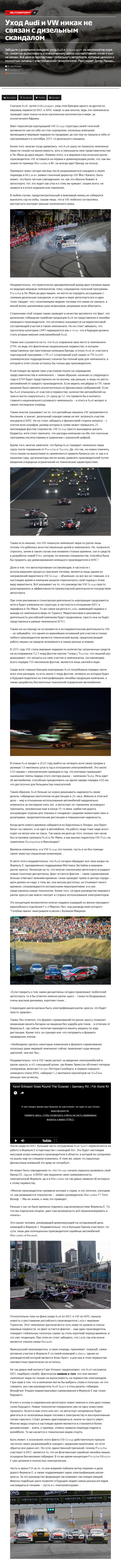 Забудьте о дизельном скандале, уход Audi и Volkswagen из чемпионатов мира по гонкам на выносливость и классическому ралли соответственно никак с ним не связан. Всё дело в перспективах глобального автоспорта, которые целиком и полностью связаны с электрическими технологиями. Рассуждает Дитер Ренкен…