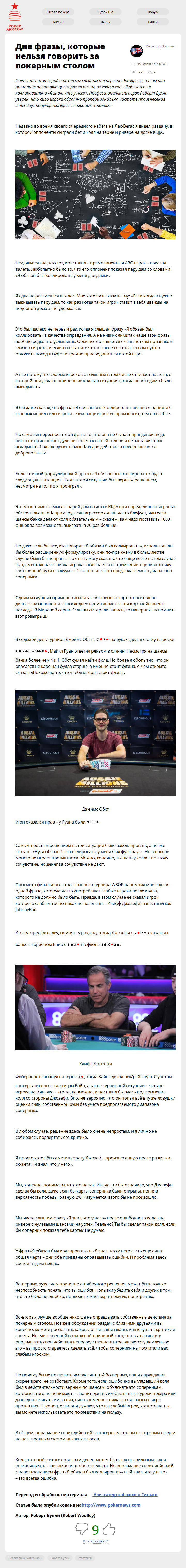 Очень часто за игрой в покер мы слышим от игроков две фразы, в том или ином виде повторяющиеся раз за разом, из года в год. «Я обязан был коллировать» и «Я знал, что у него». Профессиональный игрок Роберт Вулли уверен, что сила игрока обратно пропорциональна частоте произнесения этих двух популярных фраз за игровым…
