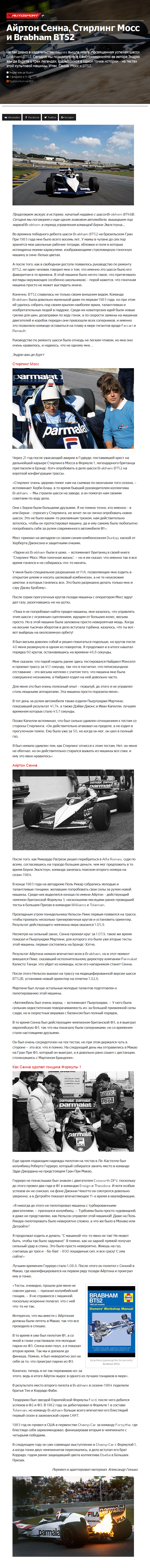 Не так давно в издательстве Haynes вышла книга, посвященная успехам шасси Brabham BT52. Сегодня мы познакомимся с воспоминаниями ее автора Эндрю ван де Бургта о трех легендах, сошедшихся в одной точке истории — на тестах этой культовой машины. Итак, Сенна, Мосс и BT52…