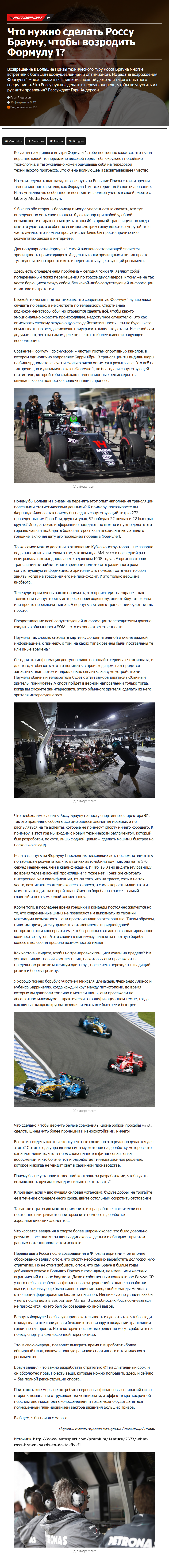 Возвращение в Большие Призы технического гуру Росса Брауна многие встретили с большим воодушевлением и оптимизмом. Но задача возрождения Формулы 1 может оказаться слишком сложной даже для такого опытного специалиста. Что Россу нужно сделать в первую очередь, чтобы не упустить из рук нити правления? Рассуждает Гэри Андерсон…