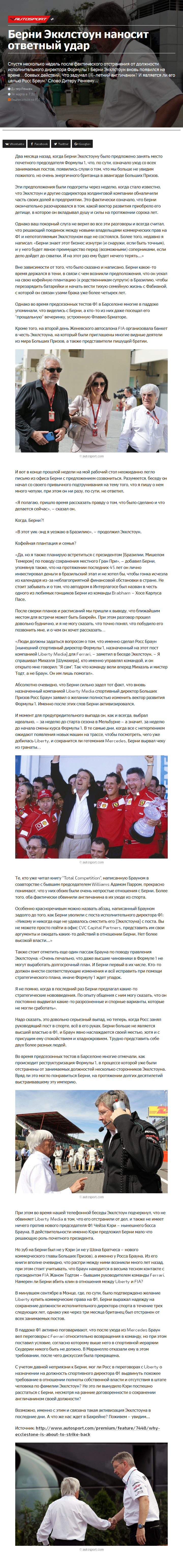Спустя несколько недель после фактического отстранения от должности исполнительного директора Формулы 1 Берни Экклстоун вновь появился на арене… боевых действий. Что задумал 86-летний англичанин? И является ли его целью Росс Браун? Слово Дитеру Ренкену…