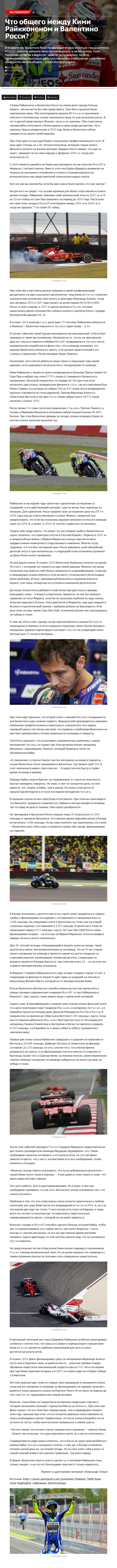 В то время как Валентино Росси продолжает упорно бороться с трудностями в MotoGP, стараясь доказать свою состоятельность, и не без успеха, Кими Райкконен остается в Формуле 1 едва ли не по инерции. Но если проанализировать ситуации двух прославленных спортсменов, у них можно обнаружить немало общего… Слово Митчеллу Адаму…
