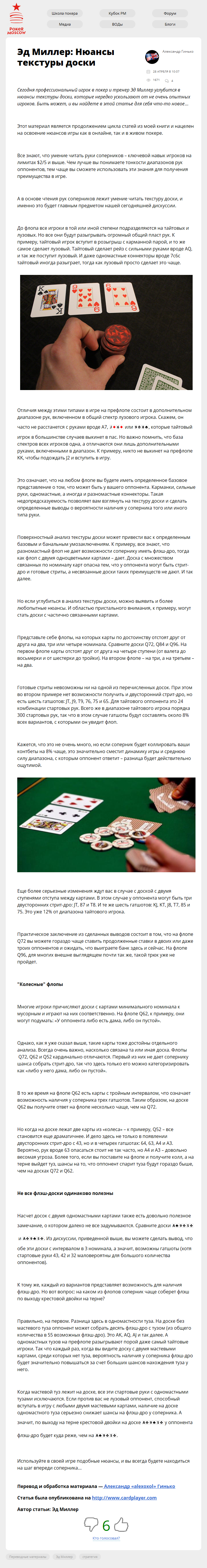Сегодня профессиональный игрок в покер и тренер Эд Миллер углубится в нюансы текстуры доски, которые нередко ускользают от не очень опытных игроков. Быть может, и вы найдете в этой статье для себя что-то новое…