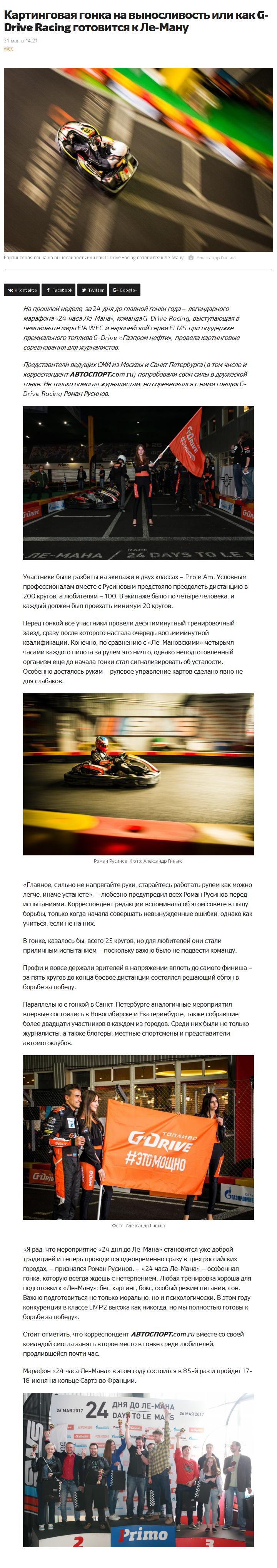 На прошлой неделе, за 24 дня до главной гонки года – легендарного марафона «24 часа Ле-Мана», команда G-Drive Racing, выступающая в чемпионате мира FIA WEC и европейской серии ELMS при поддержке премиального топлива G-Drive «Газпром нефти», провела картинговые соревнования для журналистов.