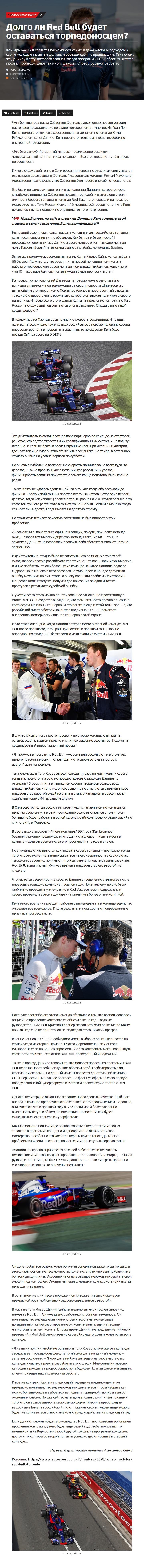Концерн Red Bull славится бескомпромиссным и даже жестким подходом к своим молодым талантам, должным образом себя не проявившим. Так почему же Даниилу Квяту, которого главная звезда программы RBR Себастьян Феттель прозвал торпедой, дают так много шансов? Слово Лоуренсу Барретто…