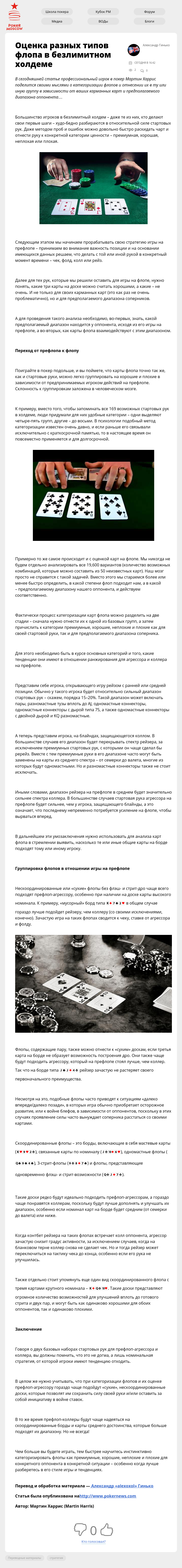 В сегодняшней статье профессиональный игрок в покер Мартин Харрис поделится своими мыслями о категоризации флопов и отнесении их в ту или иную группу в зависимости от ваших карманных карт и предполагаемого диапазона оппонента…