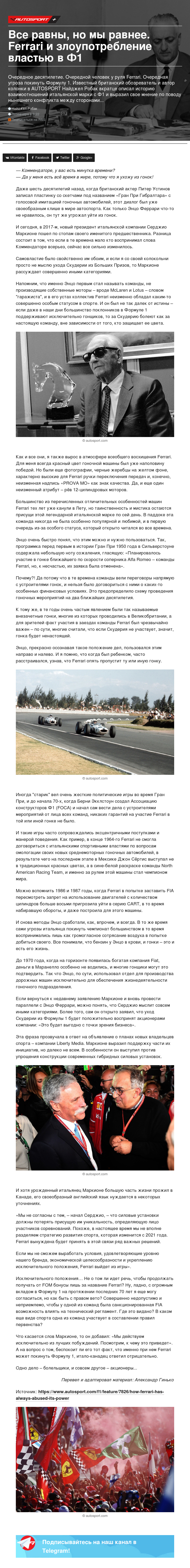 Очередное десятилетие. Очередной человек у руля Ferrari. Очередная угроза покинуть Формулу 1. Известный британский обозреватель и автор колонки в AUTOSPORT Найджел Робак вкратце описал историю взаимоотношений итальянской марки с Ф1 и выразил свое мнение по поводу нынешнего конфликта между сторонами…