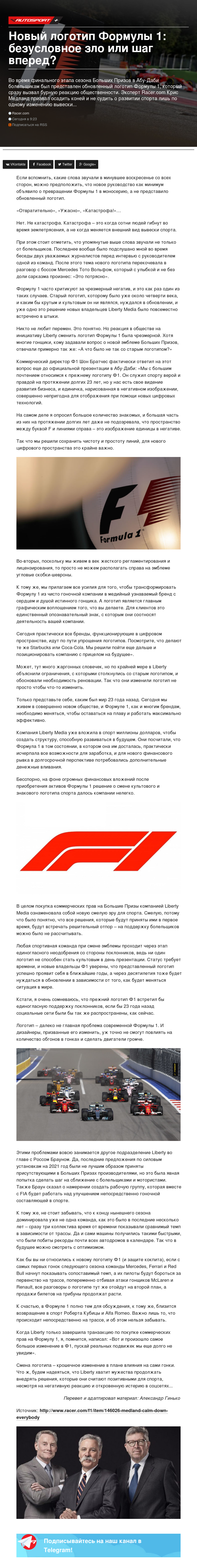 Во время финального этапа сезона Больших Призов в Абу-Даби болельщикам был представлен обновленный логотип Формулы 1, который сразу вызвал бурную реакцию общественности. Эксперт Racer.com Крис Медланд призвал осадить коней и не судить о развитии спорта лишь по одному изменению вывески…