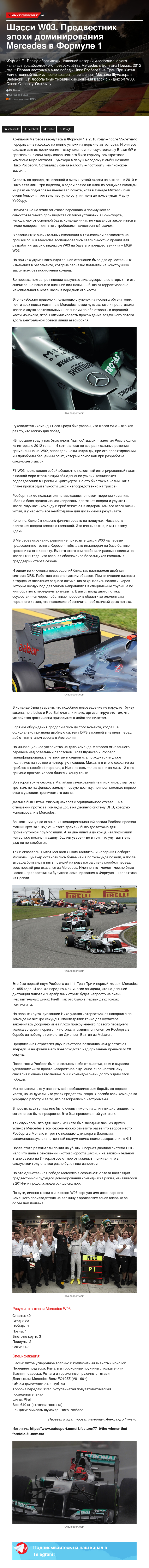 Журнал F1 Racing обратился к недавней истории и вспомнил, с чего началась эра абсолютного превосходства Mercedes в Больших Призах. 2012 год… Первая ласточка в виде победы Нико Росберга на Гран При Китая… Единственный подиум после возвращения в спорт Михаэля Шумахера в Валенсии… И любопытные технические решения шасси с индексом W03. Слово Стюарту Уильямсу…