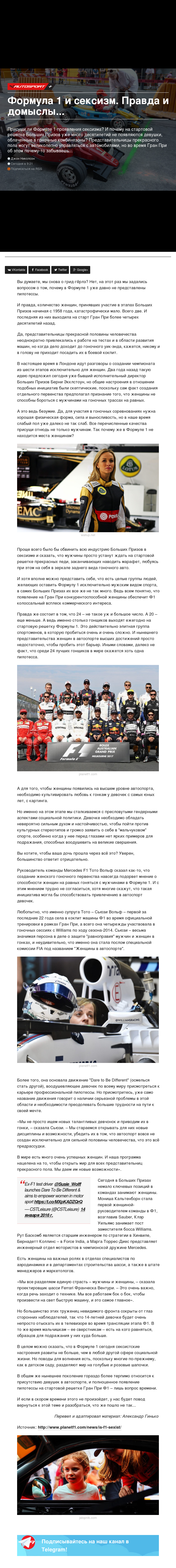 Присущи ли Формуле 1 проявления сексизма? И почему на стартовой решетке Больших Призов уже много десятилетий не появляются девушки, облаченные в гоночные комбинезоны? Представительницы прекрасного пола могут великолепно управляться с автомобилями, но во время Гран При об этом почему-то забываешь…
