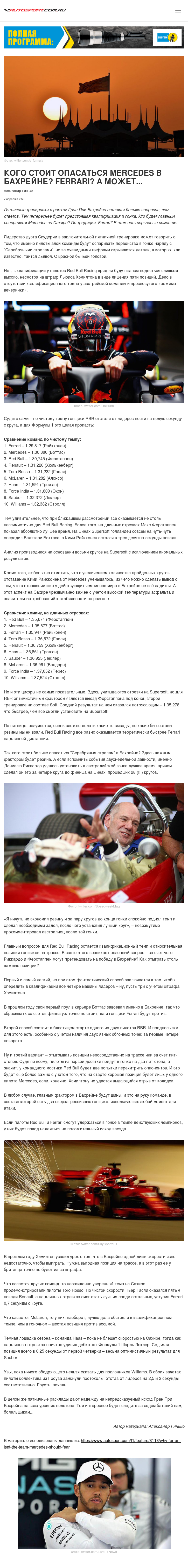 Пятничные тренировки в рамках Гран При Бахрейна оставили больше вопросов, чем ответов. Тем интереснее будет предстоящая квалификация и гонка. Кто будет главным соперником Mercedes на Сахире? По традиции, Ferrari? В этом есть серьезные сомнения…