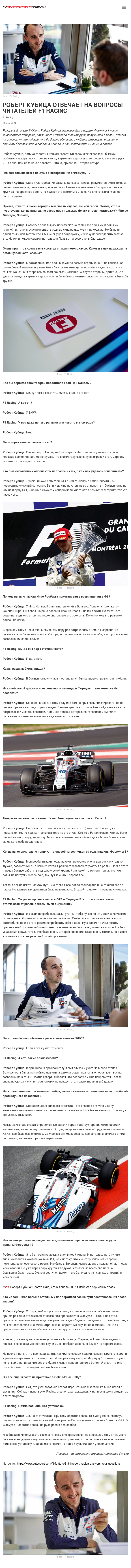 Резервный гонщик Williams Роберт Кубица, вернувшийся в паддок Формулы 1 после многолетнего перерыва, связанного с тяжелой травмой руки, полученной в ралли, ответил на вопросы читателей журнала F1 Racing обо всем: о любви к автоспорту, о ралли, о польских болельщиках, о победе в Канаде, о своих оппонентах и даже о покере…
