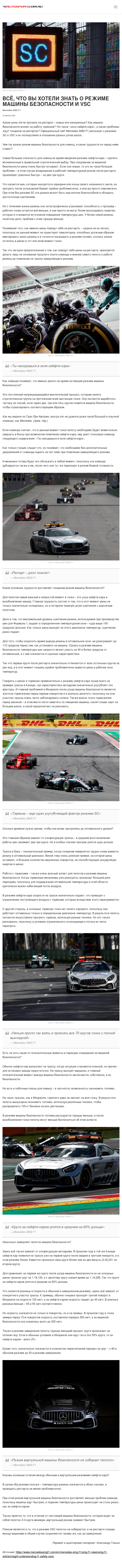 Какие шины легче прогреть на рестарте – новые или изношенные? Как машина безопасности влияет на работу тормозов? Что такое «окно сейфти-кара», и какие проблемы ждут гонщиков на рестартах? Официальный сайт Mercedes AMG F1 рассказал о режимах SC и VSC и их последствиях в отношении разных узлов шасси…