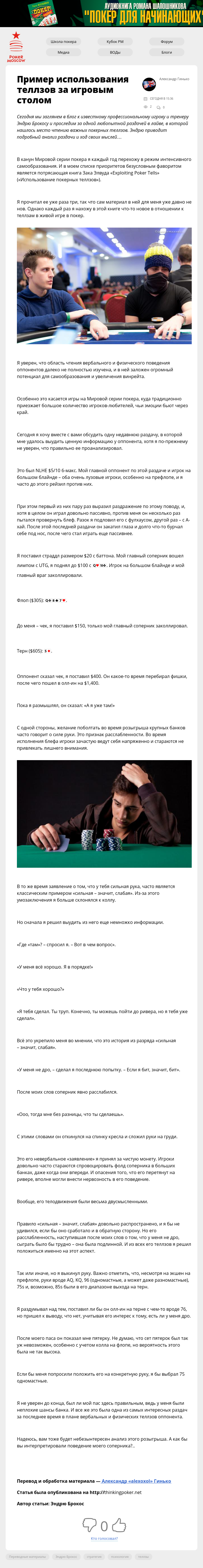 Сегодня мы заглянем в блог к известному профессиональному игроку и тренеру Эндрю Брокосу и проследим за одной любопытной раздачей в лайве, в которой нашлось место чтению важных покерных теллзов. Эндрю приводит подробный анализ раздачи и ход своих мыслей…