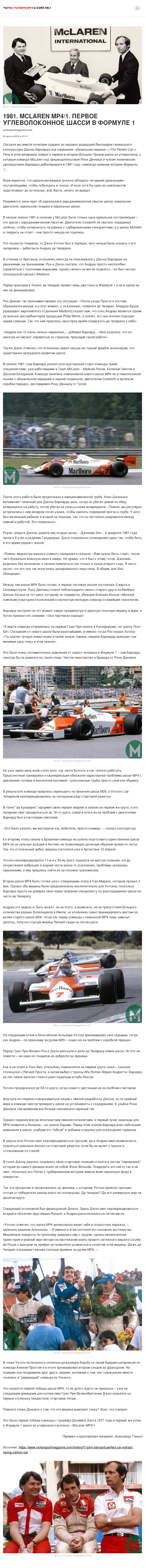 Сегодня мы вместе почитаем отрывок из недавно вышедшей биографии гениального конструктора Джона Барнарда под названием «Идеальная машина» («The Perfect Car»). Речь в этом материале пойдет о первом в истории Больших Призов шасси из углеволокна, с которым команда McLaren под предводительством Рона Денниса и чутким техническим руководством Барнарда дебютировала в 1981 году, навсегда изменив историю Формулы 1…