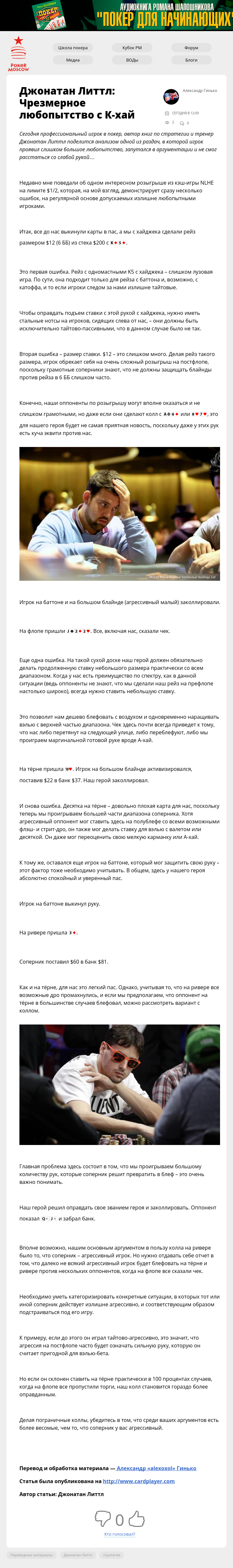 Сегодня профессиональный игрок в покер, автор книг по стратегии и тренер Джонатан Литтл поделится анализом одной из раздач, в которой игрок проявил слишком большое любопытство, запутался в аргументации и не смог расстаться со слабой рукой…