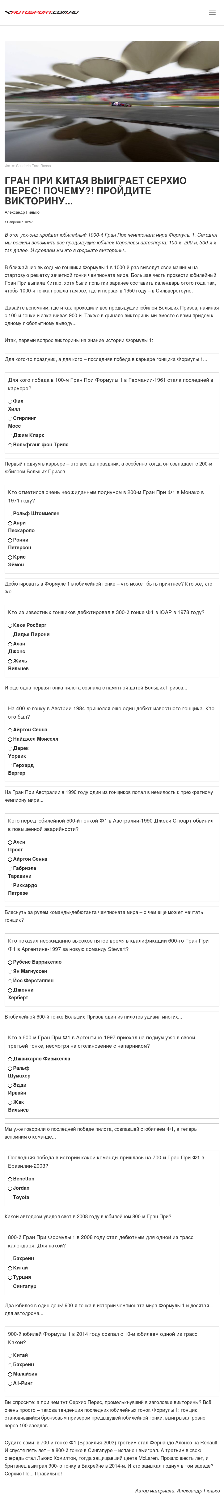 В этот уик-энд пройдет юбилейный 1000-й Гран При чемпионата мира Формулы 1. Сегодня мы решили вспомнить все предыдущие юбилеи Королевы автоспорта: 100-й, 200-й, 300-й и так далее. И сделаем мы это в формате викторины…
