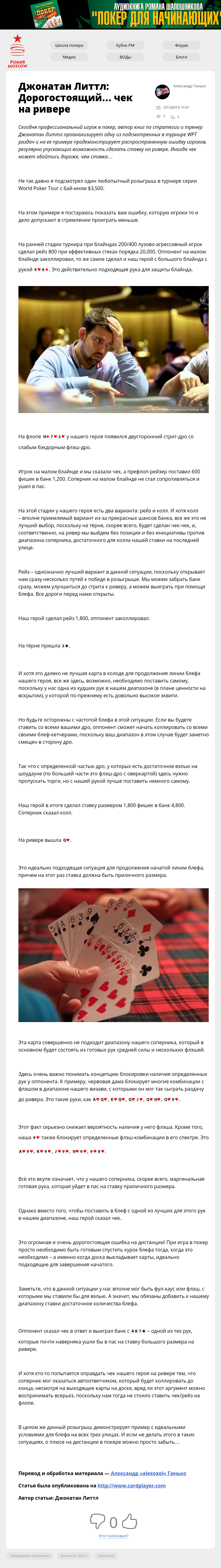 Сегодня профессиональный игрок в покер, автор книг по стратегии и тренер Джонатан Литтл проанализирует одну из подсмотренных в турнире WPT раздач и на ее примере продемонстрирует распространенную ошибку игроков, регулярно упускающих возможность сделать ставку на ривере. Иногда чек может обойтись дороже, чем ставка…