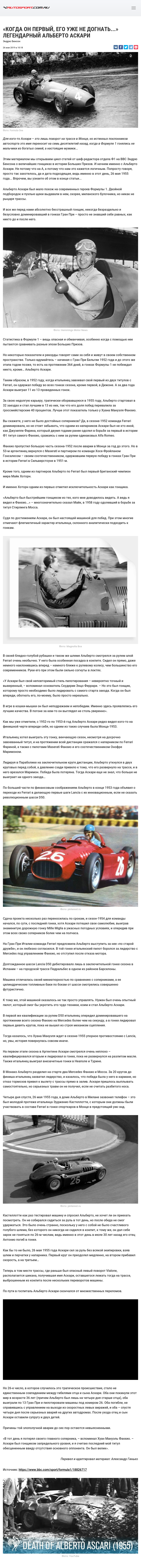 Для кого-то Аскари – это лишь поворот на трассе в Монце, но истинных поклонников автоспорта это имя переносит на семь десятилетий назад, когда в Формуле 1 гонялись не мальчики из богатых семей, а настоящие мужики…