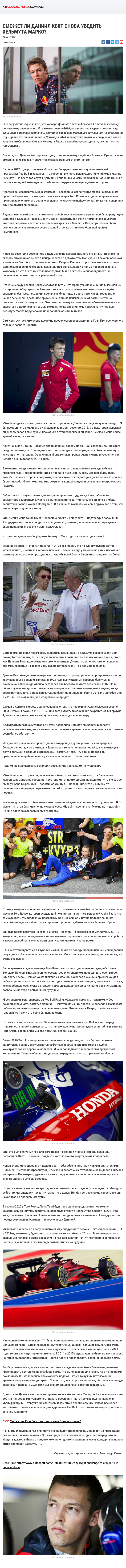 Еще пару лет назад казалось, что карьера Даниила Квята в Формуле 1 подошла к своему логическому завершению. Но в начале сезона-2019 россиянин неожиданно получил еще один шанс и проявил себя очень достойно, заработав продление соглашения на следующий год. Однако это лишь полдела, и Даниилу в 2020-м предстоит выйти на совершенно новый уровень, чтобы вновь убедить Хельмута Марко в своей профпригодности, считает эксперт Адам Купер…