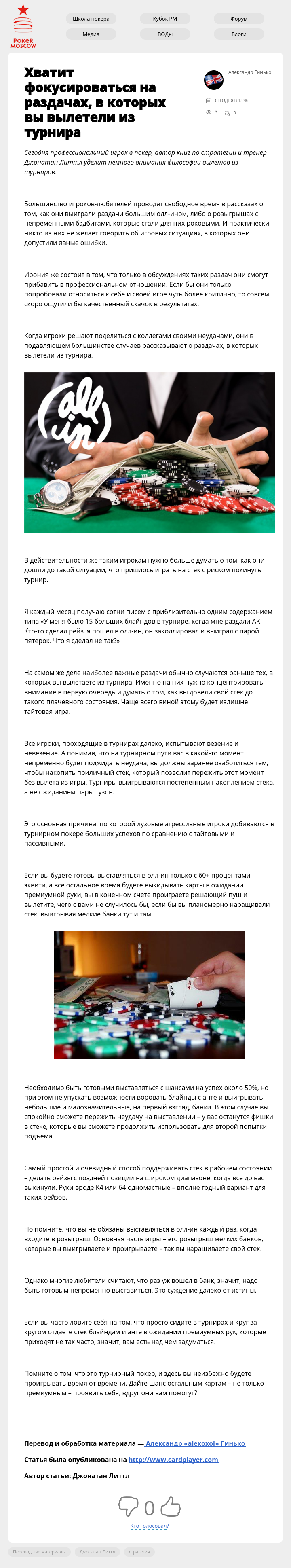 Сегодня профессиональный игрок в покер, автор книг по стратегии и тренер Джонатан Литтл уделит немного внимания философии вылетов из турниров…