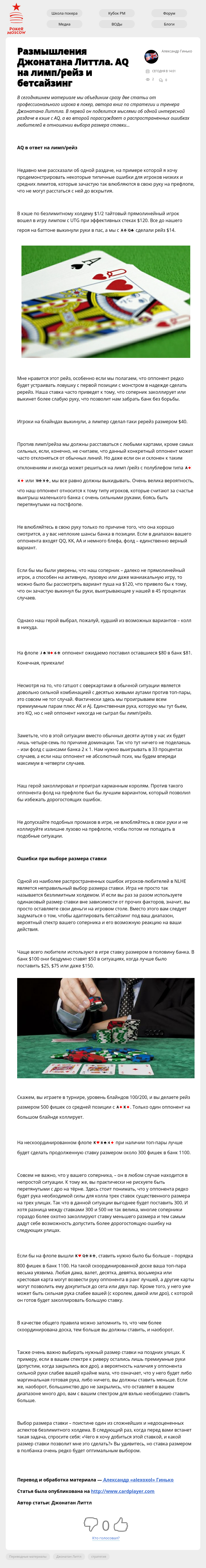 В сегодняшнем материале мы объединим сразу две статьи от профессионального игрока в покер, автора книг по стратегии и тренера Джонатана Литтла. В первой он поделится мыслями об одной интересной раздаче в кэше с AQ, а во второй порассуждает о распространенных ошибках любителей в отношении выбора размера ставки…