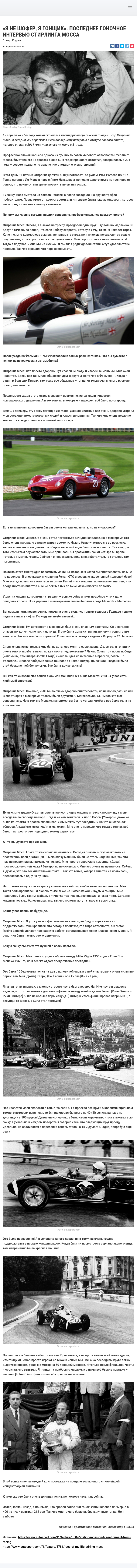 12 апреля на 91-м году жизни скончался легендарный британский гонщик – сэр Стирлинг Мосс. И сегодня мы обратимся к его последнему интервью в статусе боевого пилота, которое он дал в 2011 году – ни много ни мало в 81 год!..