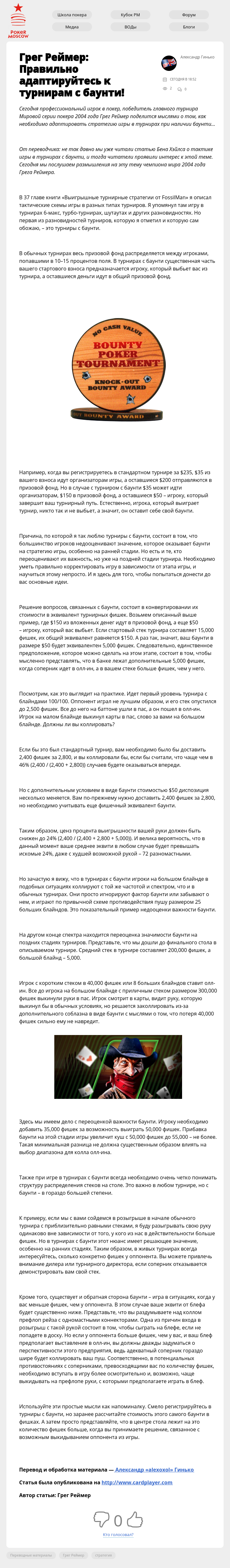 Сегодня профессиональный игрок в покер, победитель главного турнира Мировой серии покера 2004 года Грег Реймер поделится мыслями о том, как необходимо адаптировать стратегию игры в турнирах при наличии баунти…
