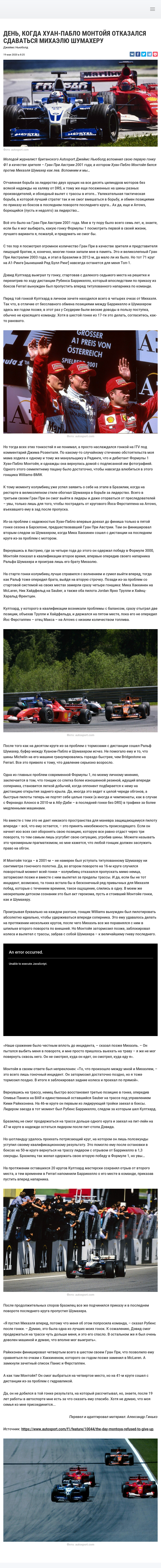 Молодой журналист британского Autosport Джеймс Ньюболд вспомнил свою первую гонку Ф1 в качестве зрителя – Гран При Австрии 2001 года, в котором Хуан-Пабло Монтойя бился против Михаэля Шумахер как лев. Вспомним и мы…