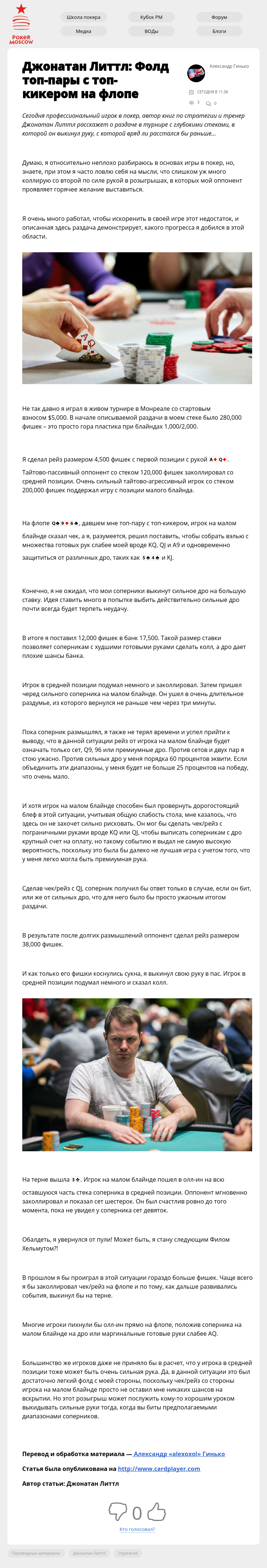Сегодня профессиональный игрок в покер, автор книг по стратегии и тренер Джонатан Литтл расскажет о раздаче в турнире с глубокими стеками, в которой он выкинул руку, с которой вряд ли расстался бы раньше…