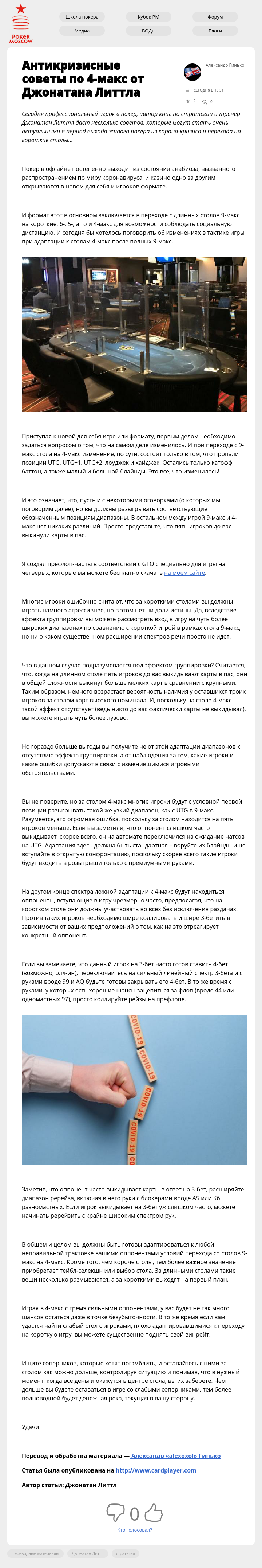 Сегодня профессиональный игрок в покер, автор книг по стратегии и тренер Джонатан Литтл даст несколько советов, которые могут стать очень актуальными в период выхода живого покера из корона-кризиса и перехода на короткие столы…